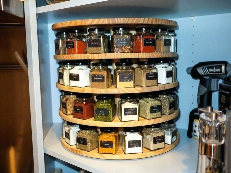 Another idea for storing spices in the cabinet, is to get a three tier organizer. You will be able to easily see and assess which spices you have. This is a great option for someone who doesn’t want to invest in uniform jars, because this will be behind closed cabinet doors.
