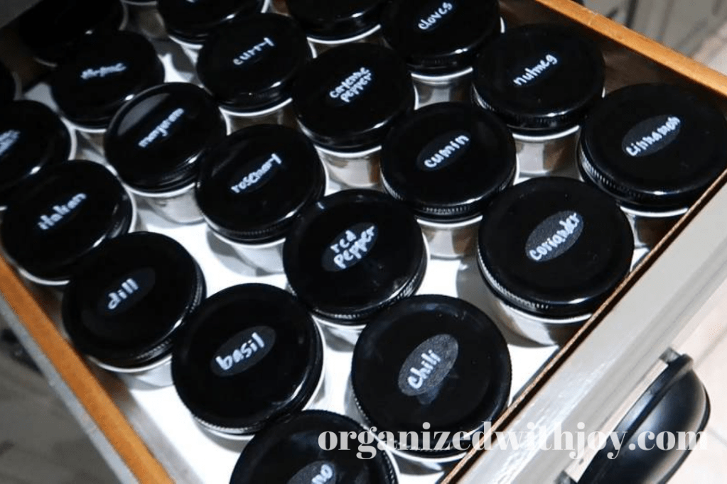 You could also use magnetic spice containers. I used these for many years. I put them in a drawer, but this is a great option for small spaces as you can store them on the side of your refrigerator, the microwave, or attach a metal piece to your back splash to store near your stove top.