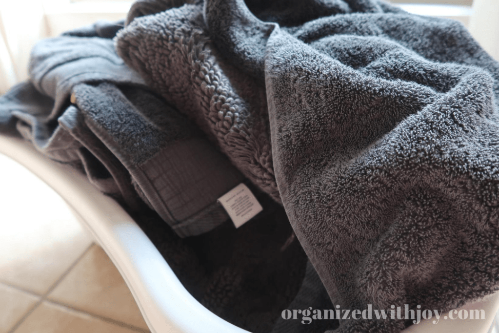 Hang dry items that are wet or sweaty before putting them in your laundry basket. This may be an obvious tip! I have found that the one drawback to only doing laundry once per week is the laundry getting moldy/musty smelling. It does help that we have a laundry shoot in both bathrooms, so our laundry is concealed. If we do have something that is wet – like a bathing suit or workout clothes we hang those up to dry before putting them in the basket.