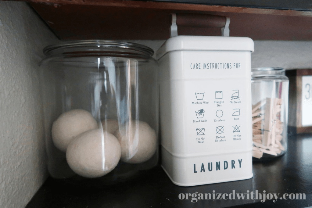 Use wool dryer balls instead of dryer sheets. They are reusable, and so environmentally friendly, and they don’t have chemicals like some dryer sheets do. You can add essential oil to the balls for a fresh scent. I like to store my dryer balls in a glass jar on a shelf about my washer and dryer as they also double as great laundry room decor!