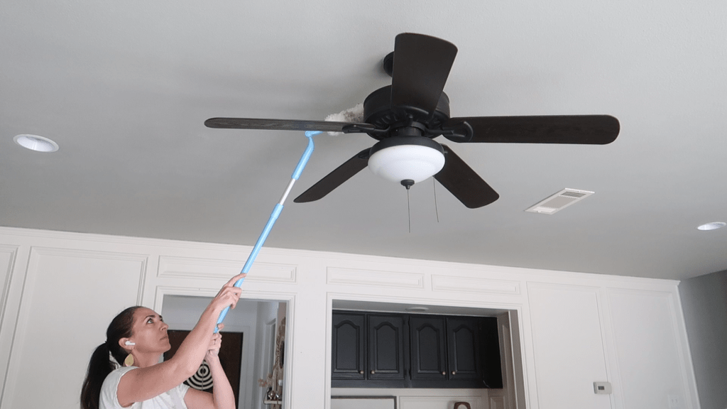 The next thing I clean is the ceiling fan or light fixture in the room. Ceiling fans especially are prone to collect dust. I have an e-cloth extension duster like this that I like to use to clean fans. After I use this duster, I will go back with an all purpose cleaning spray and paper towels to get the remaining dust. I like using the all purpose cleaning spray to make the room smell good!