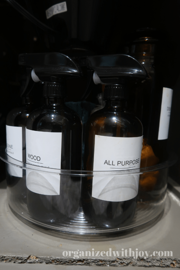 Choose uniformity when organizing and storing items. Get uniform food storage containers, cleaning bottles, and storage bins. When you have uniform jars, bins, and bottles you eliminate bright colored packaging, making your space feel more calm.