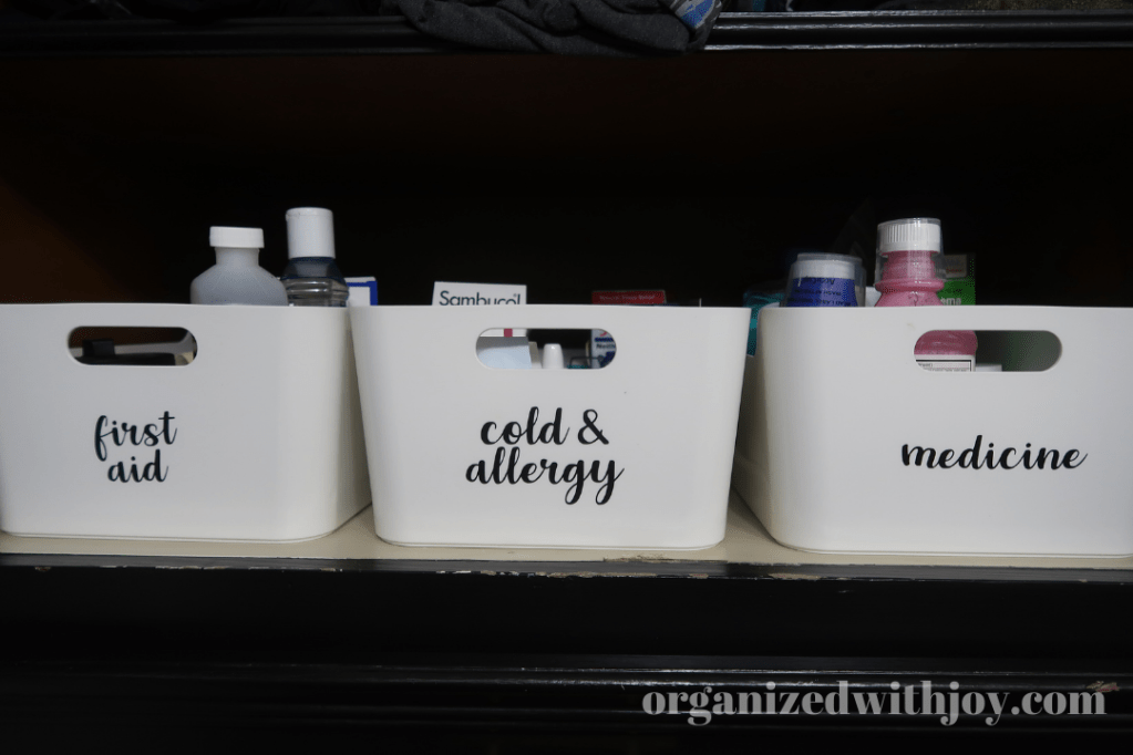 Next, group like items together in bins or baskets. When smaller items are stored away in bins or baskets, there is less visual clutter.