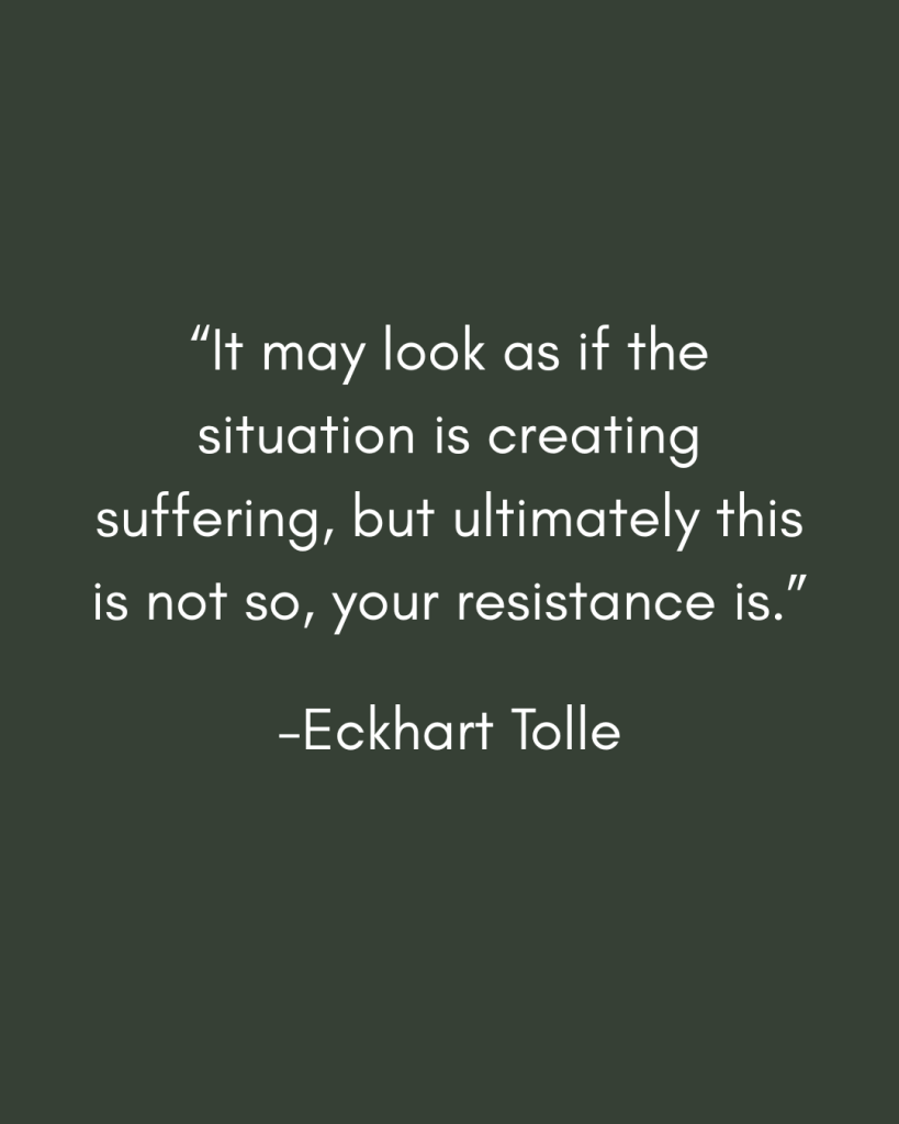 I was recently talking to a friend about this idea of acceptance. I don’t know about you, but there are some ongoing things in life that at times I will feel like I have fully accepted, but then at other moments – I guess moments of weakness, maybe when I feel tired, or lonely, or hormonal – where I don’t want to accept what is. Instead I want to try to fix or control the situation. There is a quote by Eckhart Tolle that says, “It may look as if the situation is creating suffering, but ultimately this is not so, your resistance is.” When we don’t accept what is, we will continue to suffer. Acceptance isn’t about liking or agreeing with reality, but instead acknowledging it so you can move forward with strength and clarity.